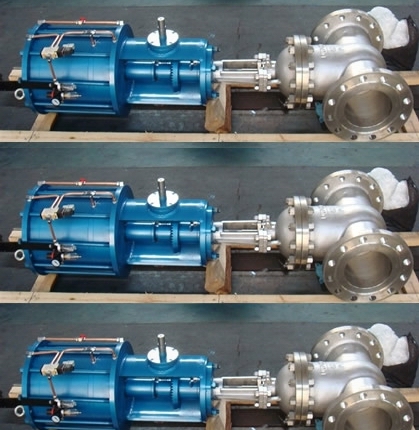 使用說明1、本閥主要由閥體、閥蓋、閘板、閥桿、密封圈、雙層氣缸及其活塞、活塞桿、隔板連同緩沖機構、手動機構、氣動-手動轉換裝置和閥蓋填料裝置等部分組成。2、上活塞行至行程上端可頂上上回訊器,使之發訊;下活塞行之行程下端可頂下下回訊器,使之發訊,以作為閘閥開閉信息在中央操作室的模擬儀表盤上進行顯示。 3、手輪上部的外伸指示桿的上升和下降,標志著該閥的閘板是處于提升狀態還是下降狀態。閘閥關閉時,外伸指示桿位于最低位置;反之,閘閥全開時,外伸指示桿位于最高位置。此即為本閥啟閉狀態的現場指示。 4、氣缸蓋上部裝有氣動-手動轉換裝置。將轉換手柄順時針方向提轉到“氣動”定位孔定位,閘閥處于氣動操作狀態;反之,將轉換手柄逆時針方向提轉到“手動”定于孔處定位,閘閥即可進行手動操作。帶錐齒輪的手柄轉換方向相反。 手動操作閘閥時,手輪旋向和普通手動閥一樣,即順時針轉為關,逆時針轉為開。帶錐齒輪轉動的相反。 注意事項1、手輪、手柄及傳動機構均不允許作起吊用,并嚴禁碰撞。2、雙閘板閘閥應垂直安裝(即閥桿處于垂直位置 , 手輪在頂部 )。 3、帶有旁通閥的閘閥在開啟前應先打開旁通閥(以平衡進出口的壓差及減小開啟力 )。 4、帶傳動機構的閘閥,按產品使用說明書的規定安裝。 5、如果閥門經常開關使用 , 每月至少潤滑一次。